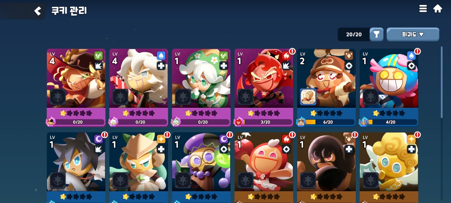 게임은 레벨업이나 각종 장비들을 착용하고 총 3명의 쿠키를 배치 할 수 있고, 태그 방식으로 소환하여 플레이 하는 전투 방식의 게임입니다. 그리고 뽑기를 통해서 얻은 똑같은 쿠키를 진급하여 성을 올려주시면 됩니다. 최대 4성까지 성장 시킬 수 있어서 0티어 같은 경우에는 동일 쿠키가 나와 뽑기를 통해 진급을 시켜주시면 됩니다.