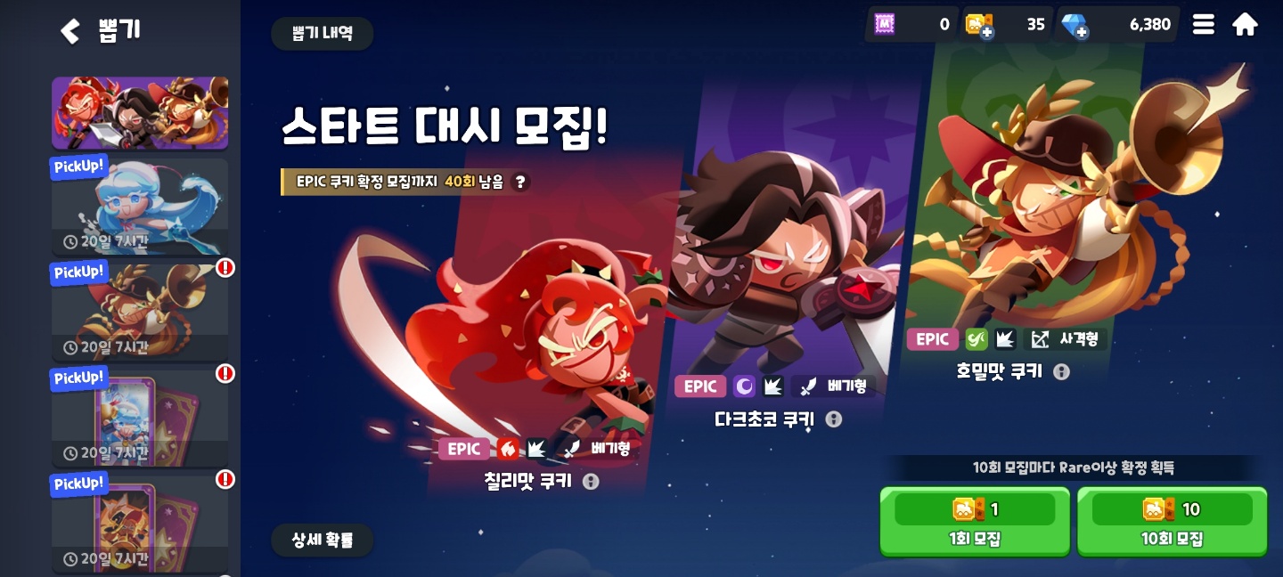 생각보다 확률이 좋아서 잘 나오기도 하고 사전 보상으로 캐모마일을 주기 때문에 2캐릭만 가지고 가도 됩니다. 그리고 잘 나오기도 하고 스타트 40회 뽑기 이후에 에픽 1개를 확정으로 주기 때문에 최소 3캐릭은 가지고 갈 수 있습니다.