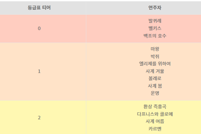 1티어 : 마왕, 박쥐, 엘리제를 위하여, 사계 겨울, 볼레로, 사계 봄, 운명